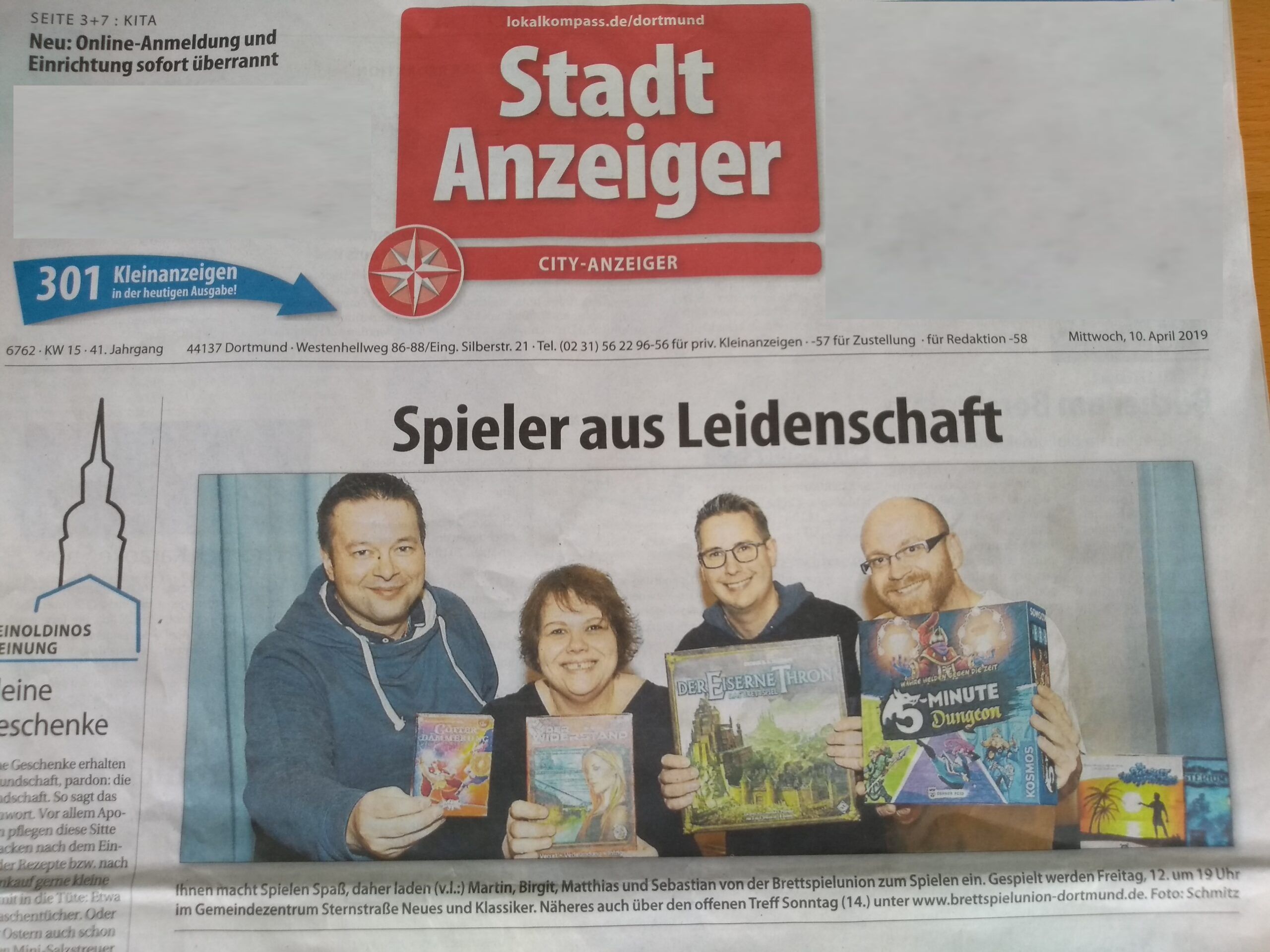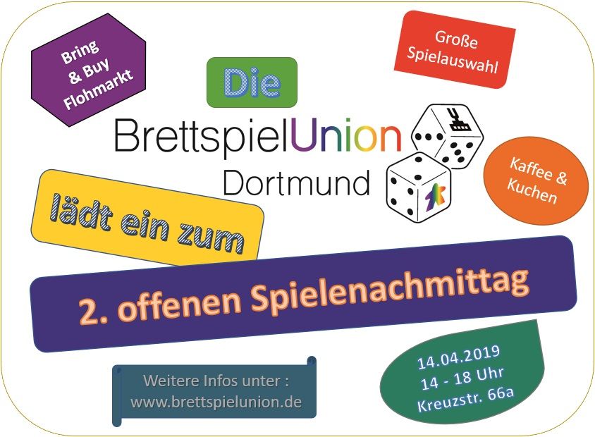 Am 14.04.2019 war es wieder soweit. Die BrettspielUnion Dortmund öffnete die Pforten zum gemeinsamen Spielen. Schon ab Mittag war es verspielten Menschen möglich in lustiger Gesellschaft zusammen zu spielen, zu schlemmen, zu klönen, auf einem Spielebazar umher zu wandeln und mit Menschen in Kontakt zu treten. Der zweite Spielenachmittag in der Nicolai Gemeinde ward eröffnet.