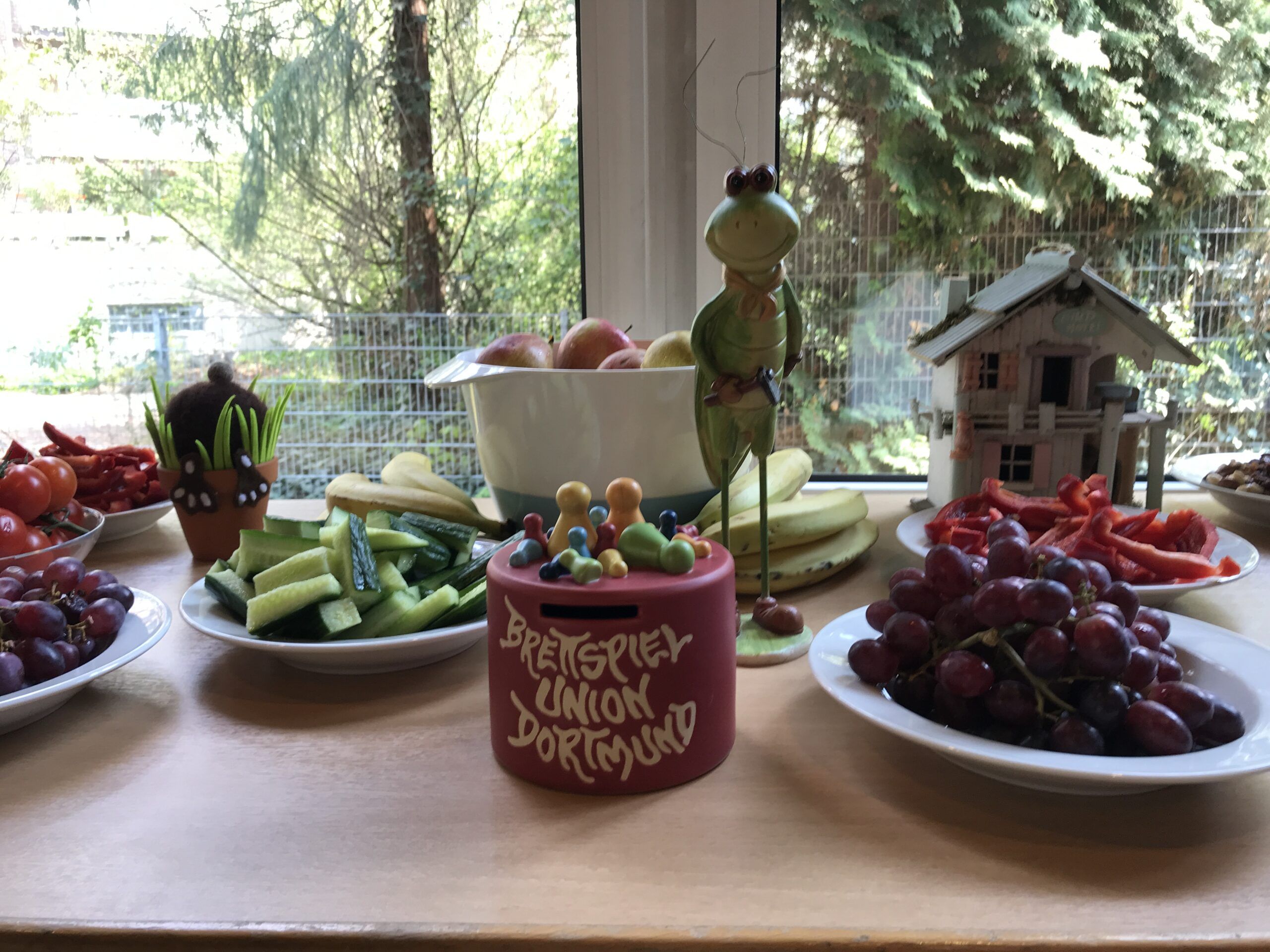 Ein reichlich gedeckter Tisch mit Kuchen, geschnittenem Gemüse, Obst, Kaffee, Saft und Wasser verschaffte dem hungrigen und durstigen Körper satte und Sitte Befriedigung.