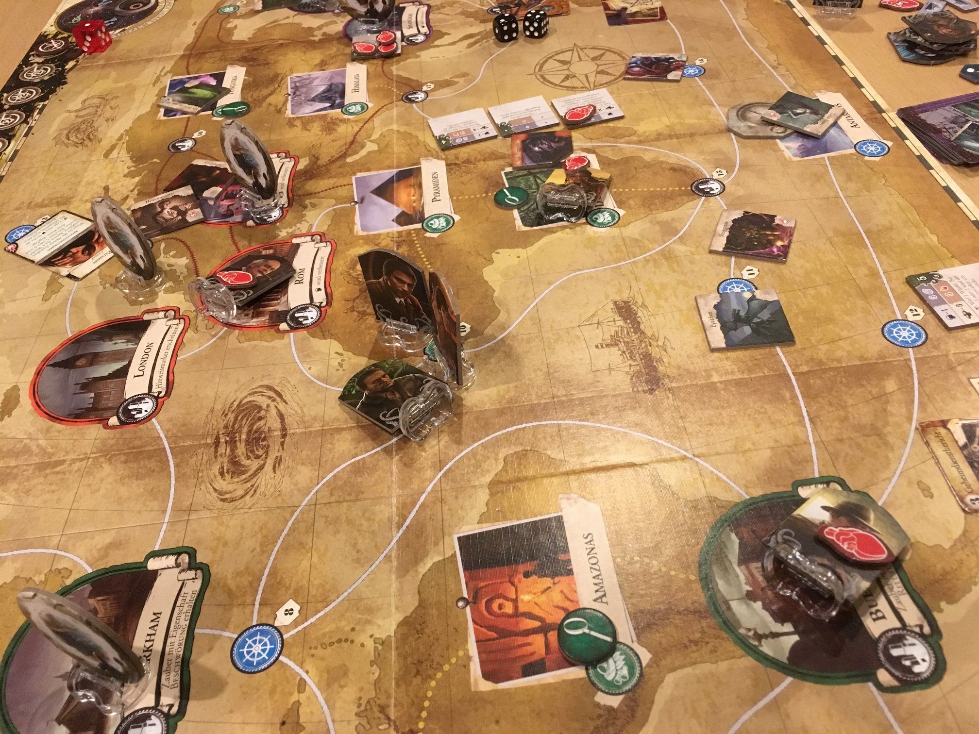Sehr oft saßen große Gruppen an großen Tischen und spielten Deduktionsspiele und manch andere Großgruppenspiele: Tempel des Schreckens, Götterdämmerung, Kampf gegen das Spießertum, Bucket of Doom, Codenames, … Die Liste wäre noch lange weiterzuführen. Besonders das eigens konzipierte Quizspiel brachte fast 20 Spielende zusammen, die in 2 Großgruppen gegen einander antragen. Sehr witzig.