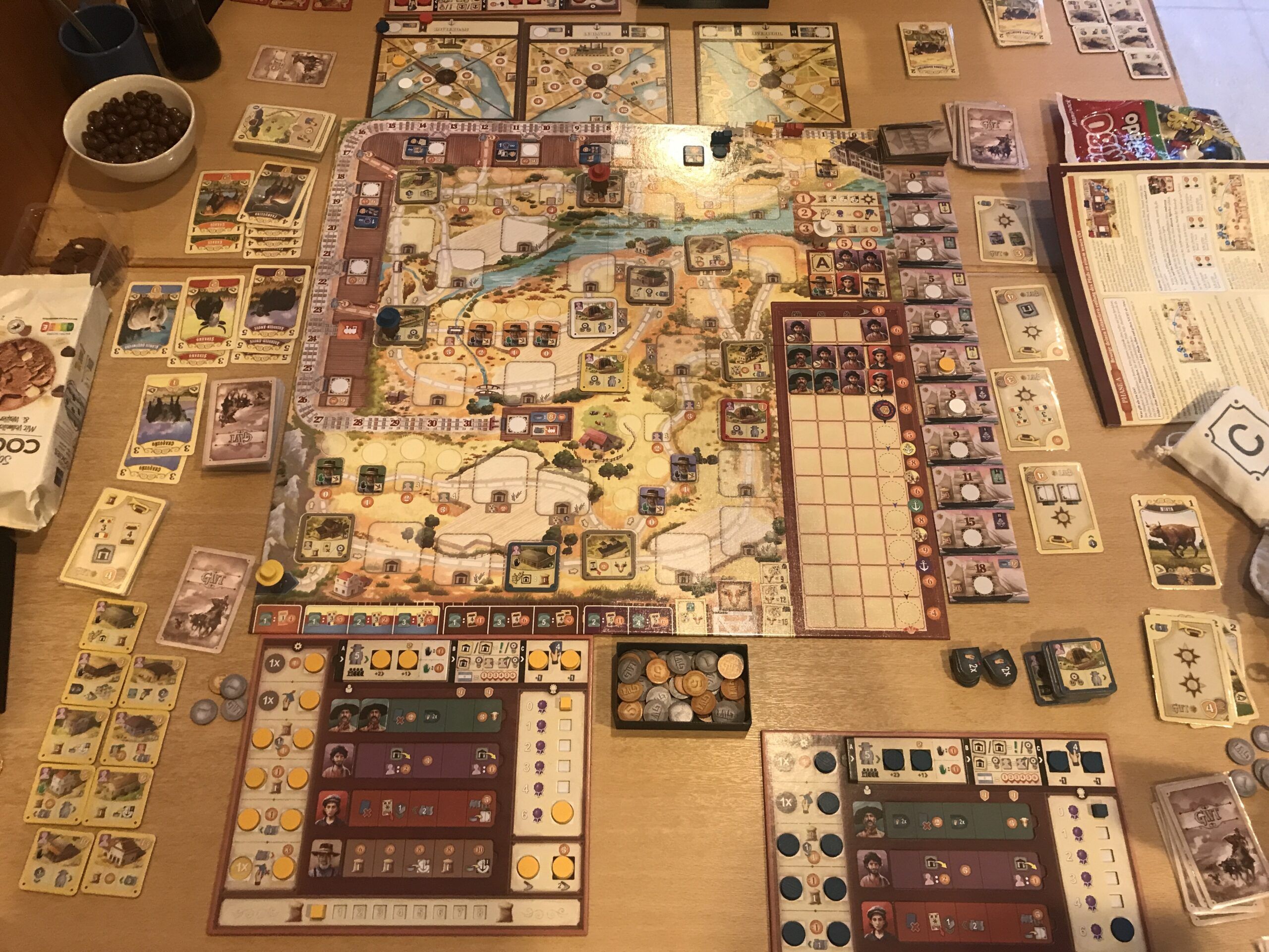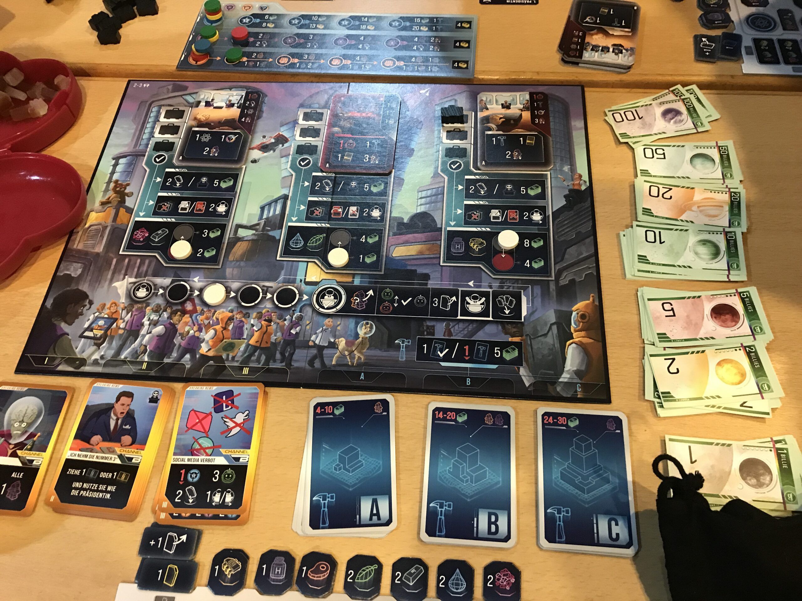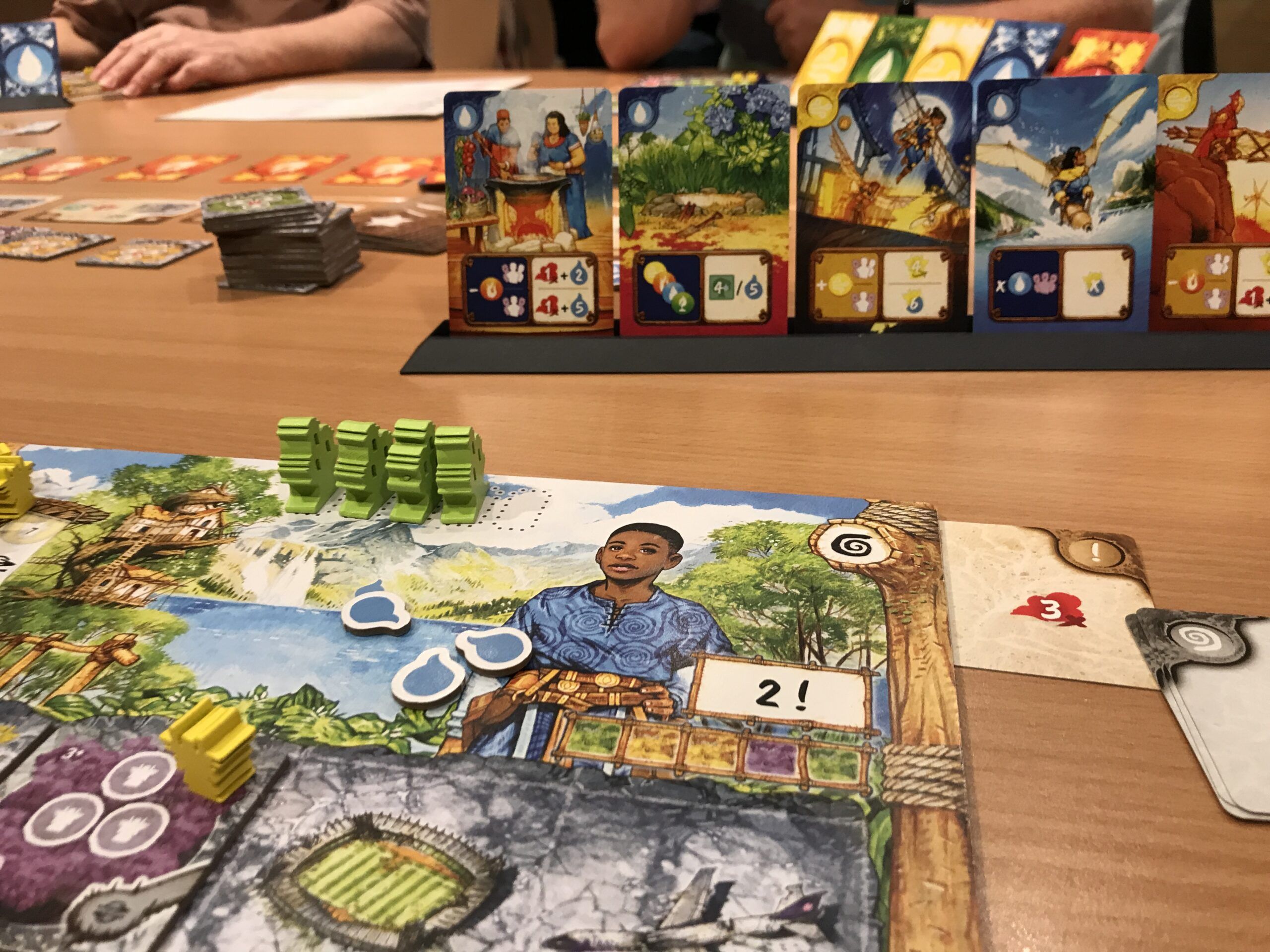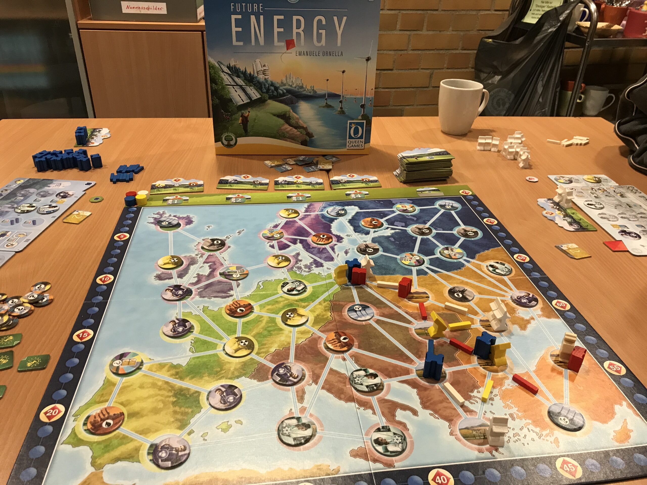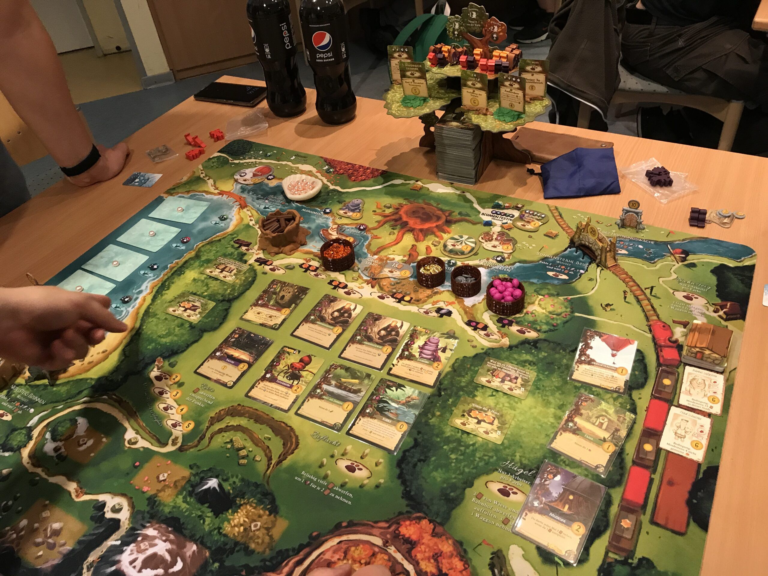 Die Sternstraße war voll. Alle Tischen waren reichlich besetzt, so dass schon Zusatztische aufgebaut werden mussten. Und auf den Tischen lagen Spiele ohne Ende. Carcassonne, Rajas of the Ganges, Through the Ages, Bandit, Night Parade of the hundred Yokai, Sattgrün und viel weitere Titel. Ein sehr opulentes Augenvergnügen war die mega-super-duper-hyper-Ausstattung von Everdell. Auf 2 großen Tischen lag die Spielmatte und alle Erweiterungen in einer Deluxe-Ausgabe. Ja richtig gelesen, ALLE Erweiterungen. Alter war das ein Klopper.